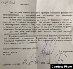 В повестке говорится, что прокуратура проводит проверку соблюдения закона о противодействии экстремизму при размещении информации в СМИ.